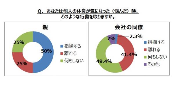 当社が実施した調査によると、他人の体臭が気になった時、会社の同僚には指摘をせずに離れるが、家族には指摘をするという人が多いという結果が出ました。(図1参照)