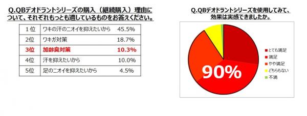 当社が販売しているニオイケア商品「QB」は、加齢臭や汗などニオイの個人差に着目をした商品で、気になるニオイを本格的にしっかりと防臭します。同商品のユーザーを対象とした調査によると、購入理由の1つとして加齢臭対策があげられており、商品の効果満足度も90%という結果に(図2参照)。