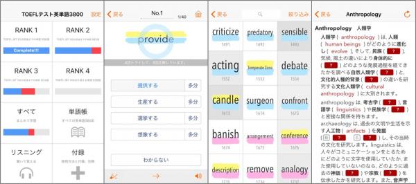 教育出版の株式会社旺文社(東京都新宿区、代表取締役社長 生駒大壱)が株式会社物書堂 (東京都江東区、代表取締役社長 廣瀬則仁)にライセンス許諾し、同社により開発されたiPhone(R)、iPad(R)、iPod touch(R)、Apple Watch(R)向けアプリケーション『TOEFL(R)テスト英単語3800(4訂版)』が、6月21日よりApp Storeにて販売開始されました。