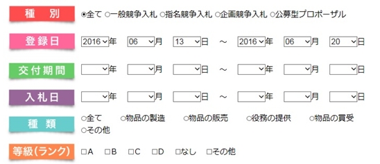新しい検索項目として、【交付期間】【入札日】【種類】【等級(ランク)】が