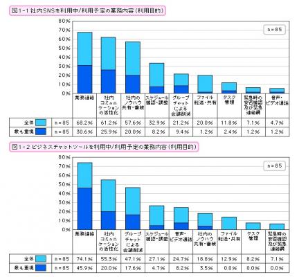 「社内SNS」と「ビジネスチャットツール」それぞれの順位を見比べると、1位と2位の項目は同じだが、「社内のノウハウ共有・蓄積」は社内SNSでは3位(57.6%)であるのに対し、ビジネスチャットツールでは6位(18.8%)で38.8ポイントの差があった。「グループチャットによる会議削減」は社内SNSが5位(21.2%)に対し、ビジネスチャットツールの方が高く3位(47.1%)で25.9ポイント差、「音声・ビデオ通話」についても社内SNSが9位(4.7%)に対し、ビジネスチャットツールの方が高く5位(24.7%)で20.0ポイント差といった違いが見られた。