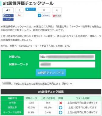 このたび公開の「alt属性評価チェックツール」は、「競合上位10サイト」と「自サイト」の文字数・設置比率・キーワード出現率を○×評価、簡易コメントを表示し、alt属性の最適化に役立てることができる無料SEOツールです。