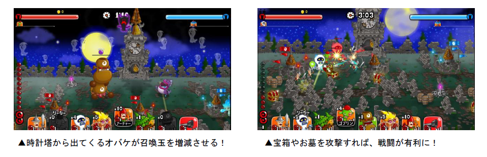 ・マップ中央の時計塔が鳴ると「白いオバケ」と「黒いオバケ」がランダムで出現する