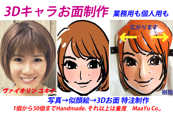 ヴァイオリン ユキナ写真と中央ユキナ似顔絵。左が制作した3Dキャラお面