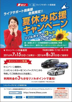 その一環としてこのほど夏休みシーズンを迎えるこの時期、「ニッポンレンタカー」とコラボした『夏休み応援キャンペーン』をライフサポート倶楽部会員様向けに企画いたしました。