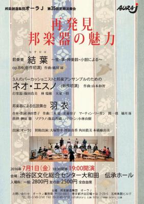 同演奏会で再演される三木稔とオーラJメンバーによる「羽衣」は三木稔の作曲したオペラを中心に、メンバーの作曲もくわえて、邦楽器の多様な表現を味わいつつ、歌の魅力も聴くことができる作品です。文化庁の本物の舞台芸術にも採択され、再演を重ねていますが、今回は久々の東京での上演であり、この機会に観劇されることをおすすめ致します。