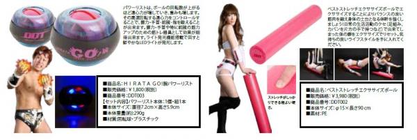 今回のラインナップは、女性の憧れる鍛え抜かれた、力こぶ(上腕二頭筋)とぶ厚い胸板を効果的に手に入れる事ができる、本体が回転するプッシュバーのローリングプッシュアッパー。割れて引き締まったウエストラインと腹筋が作れるパワースライダー。遠心力が加わり新感覚でトレーニングが楽しめ、鍛えにくい手首や前腕、腕をフル稼働できるHIRATA GO!腕 光る!パワーリスト。女性にも人気のストレッチ用品のベストストレッチエクササイズポール。超発汗で人気のシリーズ累計100,000万枚を誇るサウナスーツもDDTオリジナルでデザインしたユニセックスで着用できるDramaticサウナスーツ。引き締まった身体づくリをサポートするアイテムラインナップです。