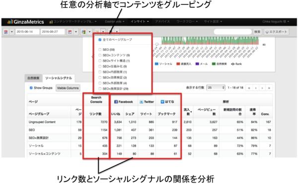 Ginzamarkets株式会社(本社:東京都港区、代表取締役社長:レイ・グリセルフーバー)が提供するコンテンツマーケティング&SEOツール『GinzaMetrics』は、6月30日、コンテンツ分析管理機能をバージョンアップしました。これにより、自社の分析軸に応じてコンテンツをグルーピングし、ソーシャルシグナルと外部リンクの分析等を網羅的にできるようになります。