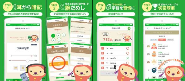 対訳や例文の穴埋めで意味を答える問題のほか、音声を聴いてスペリングを答える問題など、総合的な単語力を測ることができ、テスト結果をもとにした全国ランキング/志望校ランキングで、実力のチェックもできます。高校単位での対抗ランキングもあるので、友達と協力して楽しみながら単語力を磨けるようになっています。