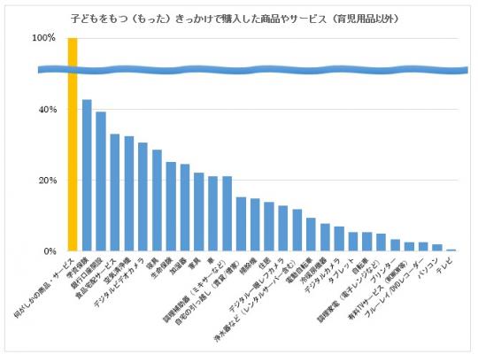「子どもをもつ(もった)ことをきっかけとして、新たに購入した商品やサービス(育児用品以外)は何ですか?」と質問をしたところ、すべての回答者が何かしらの商品・サービスを購入するという結果になりました。育児用品に限らず、幅広い業界にとって、子どもをもつパパママは新規購買が発生し、新たな需要が生まれる重要な時期といえます。