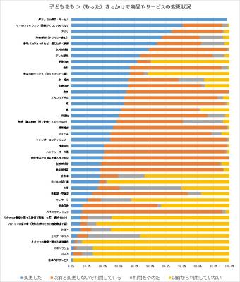 「子どもをもつ(もった)きっかけで、購入基準を変更したパパママ自身向けの商品やサービスを教えてください」という質問に関しては、約99%の方が何かしらの商品・サービスを変更したという結果になりました。子どもを持つということが、新規購入だけでなく、パパママが自分のために継続的に購入する商品やサービスについても購買行動を変化させる重要な時期といえます。