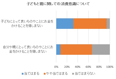 「子どもにとって良いものやことに関してはお金を惜しまない」という項目に関して当てはまる、やや当てはまると90%以上のパパママが答え、「自分や親のとってよいものやことにお金をかけることを惜しまない」という質問と比較すると大きく差がでる結果となった。