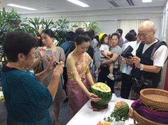 講師はカービングの本場タイの有名コンテストで2年連続女王賞(金賞)を受賞し、日本国内でも日本タイカービング協会主催「第1回カービングコンテスト」で優勝した腕前のナッタヤ講師(フルーツ・ソープカービングスクール講師)。最近はZIP!、お願いランキング、朝チャン、目覚ましテレビなど多数の番組で取り上げられている、いま1番注目のカービングアーティスト。同じく人気の高い、石川講師、加藤講師との合作による作品展です。