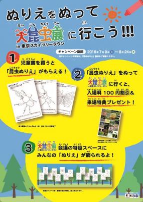 「大昆虫展in 東京スカイツリータウン」は、昨年は期間中に約70,000 人(前年比170%)を動員。今年で4 回目を迎える夏休みの人気イベントです。「TOPIA Project」による書店キャンペーンでは、ポプラ社の協力のもと展開書店で児童書購入者に「大昆虫展」入場割引券付きの「昆虫ぬりえ」を配布します。「昆虫ぬりえ」は「ヘラクレスオオカブト」「ギラファノコギリクワガタ」「オオムラサキ」の全3 種があり、イラストは「マンガでマスター! 昆虫教室」(ポプラ社)原作者の藤見泰高氏の描き下ろしとなっています。