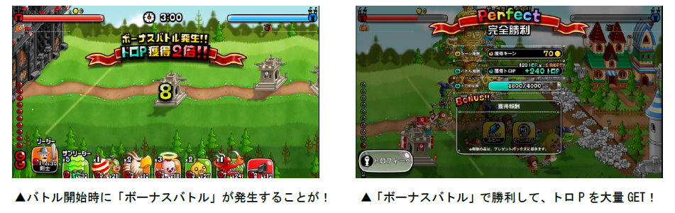 また、バトルを開始すると「ボーナスバトル」が発生することがあり、バトルの勝敗に関係なく、獲得トロP が