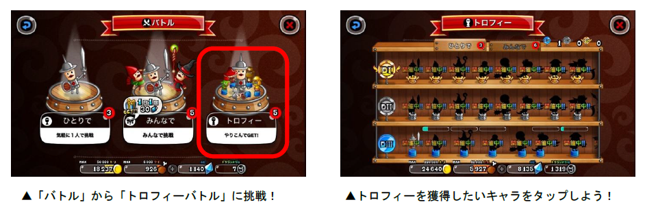 「トロフィーバトル」は、各キャラのトロフィー獲得を目指して、全国のプレイヤーとバトルを行ないます。