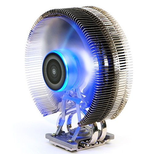 CPUクーラーと一体となった、120mm PWM対応ブルーLEDファンを搭載しています。特徴的な8-Shaped Bending Designと高輝度ブルーLEDがシステムを色鮮やかにドレスアップします。