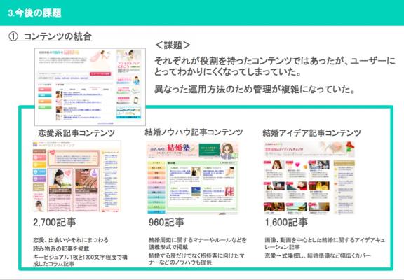 第2部では、みんなのウェディング社の小口氏より、ユーザーニーズに合わせたコンテンツの最適化施策について紹介いただきました。大量に存在していた既存コンテンツをユーザーニーズに合わせて、優先度の高い順に改善していくことで、大きな成果を上げることができたとのことです。スピーディにPDCAを回していくために、シンプルなオペレーションを構築することの重要性も強調されていました。今後はサイト構造レベルの最適化も進めていかれるとのことです。