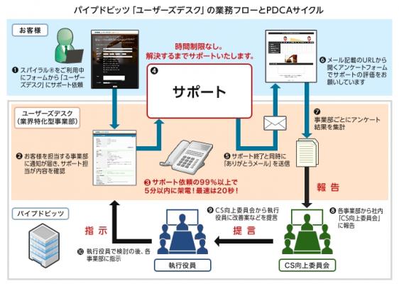 パイプドビッツは、2010年に「スパイラル(R)」担当組織に業界特化型事業部制を採用し、それまで「スパイラル(R)」のサポートを担っていたサポート専門部署を解体し各事業部に人員を組み込むことで、各業界特有の専門的なサポートを可能にしました。加えて、「スパイラル(R)」で構築した「ユーザーズデスク」は、お客様がパイプドビッツに電話をかける必要はなく、「スパイラル(R)」の操作画面内にある呼び鈴代わりのボタンを押し内容を送信すると、最短20秒から5分以内に内容を把握したパイプドビッツの担当事業部から電話を差し上げるため、お客様をたらい回しやお待たせすることなく、操作方法から企画や設計相談、契約関係まで、幅広く対応しています。