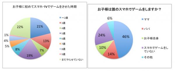 「お子様に初めてスマホ・TVでゲームをさせた時期を教えてください」と質問をしたところ、80%近くの多くの子どもが何かしらのスマホ・TVでゲームに触れているという結果がでました。~2歳までに各種機器を触らせるケースが約20%と比較的多く、早い段階からゲームに触れさせている親の像が浮かびます。