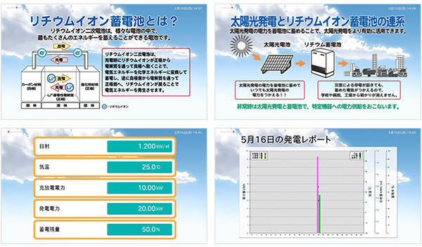 蓄電システムや、パワーコンディショナと通信し、データ収集します。収集したデータはCSV形式(「 , 」区切りのテキストファイル)での保存や、FTPサーバに転送することが可能です。また、収集した計測データや画像をスライドショーとして画面に表示します。