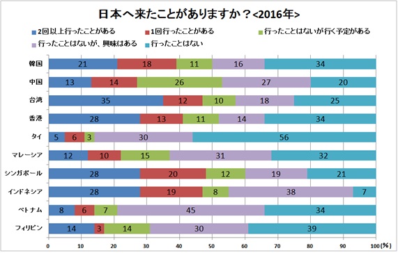 2015年の訪日外国人観光客数は1973万人を突破し、前年比47.1%増と過去最高の伸びを記録しました。2016年も増加傾向は変わらず、1月から5月の5ヶ月間で972万人を超え、年間では2000万人を超えると予想されています。日本政府が訪日外国人観光客数の目標を、2020年に4000万人、2030年には6000万人と策定したことを受けても、今まで以上にインバウンド市場の盛り上がりが予想されます。アウンコンサルティングでは、訪日観光客の中でも割合の多いアジア各国・地域の人々が日本に対してどのような感情を持っているのかアンケートを実施、また、昨年行った同調査と比較し、アジア各国・地域の人々の日本に対する意識が、どのように変化したのかを調査いたしました。