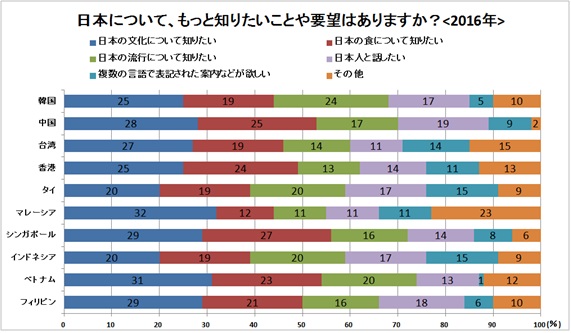 今年は、訪日外国人の訪日目的とニーズを知るため、「日本についてもっと知りたいことや要望はありますか?」という質問を追加致しました。この質問に対し、「日本の文化について知りたい」という回答が約30%、次いで「日本の食について知りたい」という回答も約20%と、この2回答で約50%の回答となっています。一つ目の質問「日本という国が好きですか」と二つ目の質問「日本人が好きですか」で日本国・日本人に対する好感度が上がっていた中国は、「日本人と話したい」という回答が19%と最も多く、一つ目と二つ目の質問で中国と逆に好感度が下がっていた台湾は、同回答が11%と最も少ない結果となりました。その他の回答として、多くの国では「マンガやアニメについて知りたい」という回答が多くあり、クールジャパンの主軸でもある近代文化についての要望が多くみられました。タイからは「飛行機代を安くしてほしい」という要望もあり、2013年7月以降ビザの緩和により訪日しやすい環境にはなっていますが、飛行機代の部分でまだ改善の余地があるようです。その他の回答については、以下にて一部抜粋したものを記載致します。