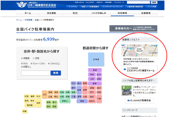 一般社団法人 日本二輪車普及安全協会では、二輪車駐車場検索サイト「全国バイク駐車場案内」を運営しており、平成28年7月現在で6,800場の駐車場情報をユーザーの皆様にご提供しております。