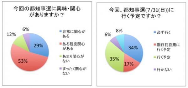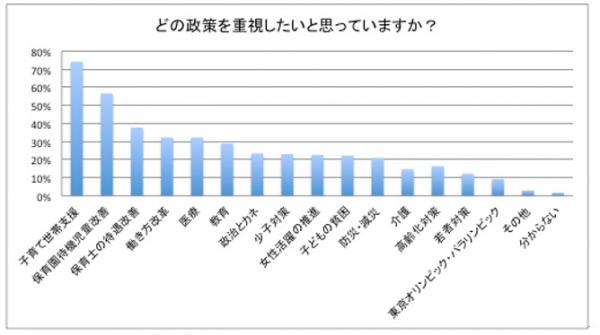 今回の結果では、子供が小さい方々が多いため、子育てに関わる項目および自分たちの世代に関わる項目に関心が高いことが伺えます。一方、舛添さんの辞任のきっかけとなった、政治とカネ(23%)への関心は低いことが結果でわかりました。また、東京オリンピック・パラリンピック(9%)への関心も非常に低く、4年先であることや、予算が膨大であることからイメージが湧かず、自分ごととして捉えていないのではないと考えられます。
