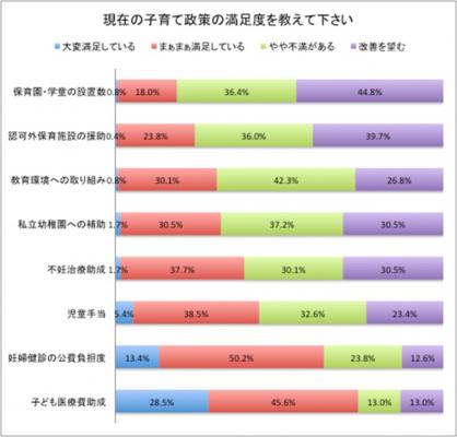 「現在の子育て政策の満足度を教えて下さい」と質問をしたところ、「保育園・学童の設置数」に関して、不満の方が約80%、続けて、「認可外保育施設の援助」に関して、不満の方が約75%と「保育」に関する不満の高さが伺えました。続けて、「教育環境への取り組み」に関して、不満の方が約70%、「私立幼稚園への補助」に関して、不満の方が約67%と、「教育」に関する不満もあるようです。一方、「妊婦検診の公的負担度」や「子ども医療費助成」といった、「医療」に関する政策に関しては、比較的満足度が高い姿が浮かびました。