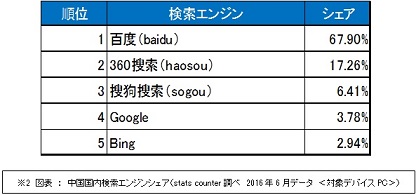 「360捜索(前名称:好捜 haosou)」は、Qihoo 360 Technology Co. Ltd(以下 Qihoo 360社)が運用する検索エンジンであり、中国国内で百度(baidu)に次ぐ検索エンジンシェア(※2)を誇っています。シェア拡大理由の一つとして、「360捜索」が持つ中国国内シェア1位の「360 Security」やシェア2位の「360ブラウザ」があります。オフィスにいるユーザーは「360ブラウザ」および「360捜索」を利用する頻度が高いと言われ、百度でリーチしきれないユーザーへ効率的にアプローチが可能となります。