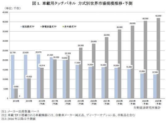 ◆2016年の車載用タッチパネル世界市場は前年比115.9%の3,898万パネルと予測