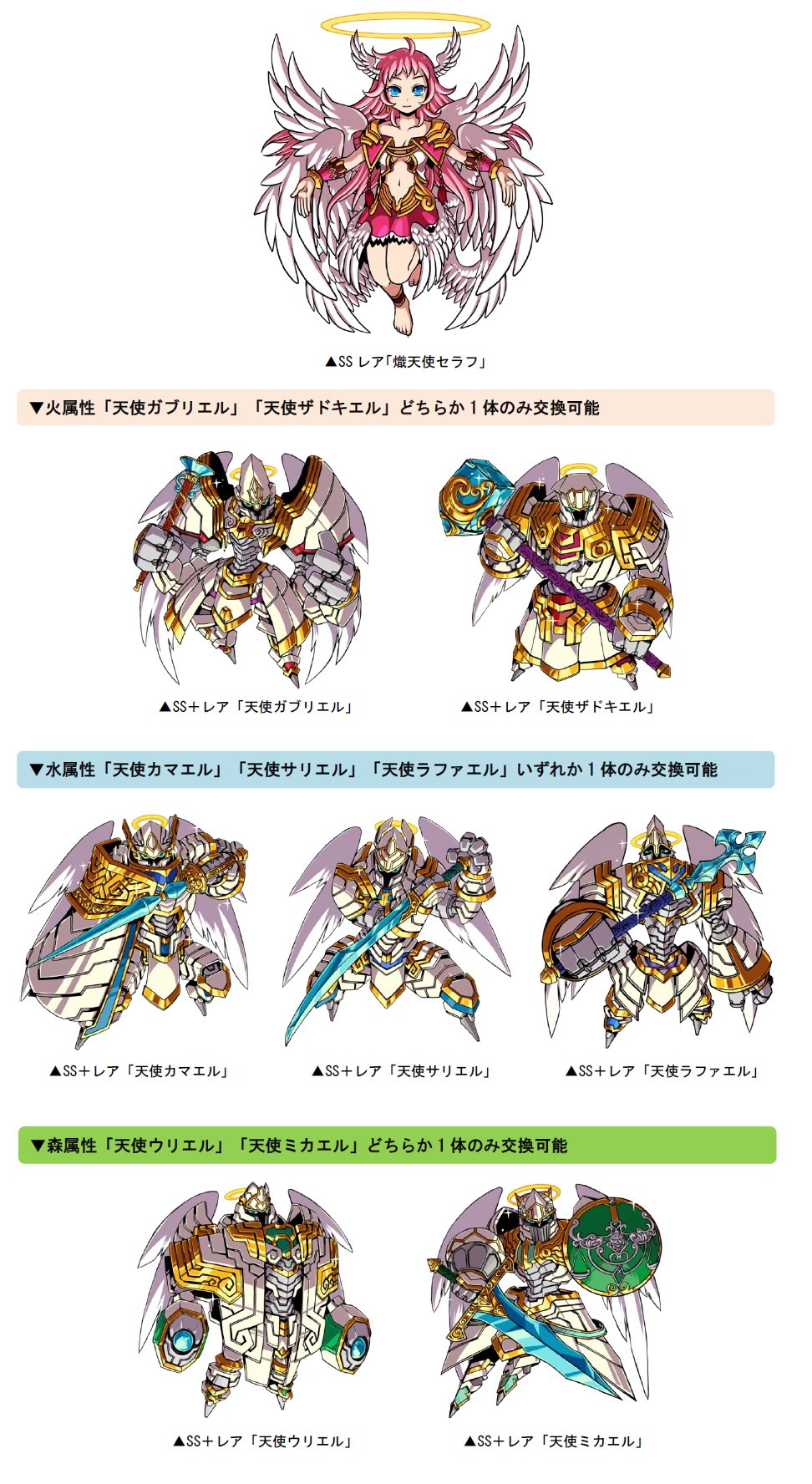 ・火属性SS+レア「天使ガブリエル」「天使ザドキエル」※どちらか1体のみ交換可能