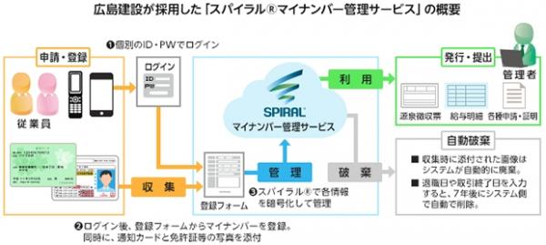 広島建設は、注文住宅を中心とした分譲住宅、リフォーム、公共施設、商業施設など、年間700棟もの施行実績を誇るハウスメーカーです。マイナンバー制度対応のために、2015年12月に「スパイラル(R)マイナンバー管理サービス」を採用し、翌2016年1月の納品後、試行期間を経て4月に本格運用し、従業員及び扶養家族の個人番号400件超を約2週間で収集完了しています。収集された個人番号は、パイプドビッツが保管業務の委託先となり、高セキュアなクラウド環境において、暗号化された状態で安全に管理しています。