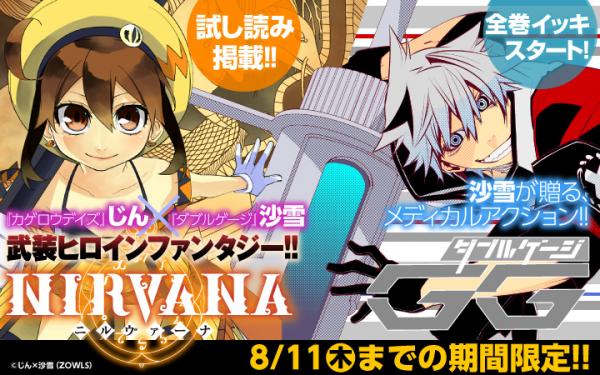 小学館発のコミックアプリ「マンガワン」は、このたび株式会社KADOKAWA・コミックジーン編集部とのコラボレーション第1弾として、月刊コミックジーン好評連載中の「NIRVANA-ニルヴァーナ-」(原作・じん×沙雪(ZOWLS)) 作画・沙雪 株式会社KADOKAWA刊)試し読みと、「ダブルゲージ」(著・沙雪 株式会社KADOKAWA刊)全巻イッキ読みキャンペーンを同時に開催致します。