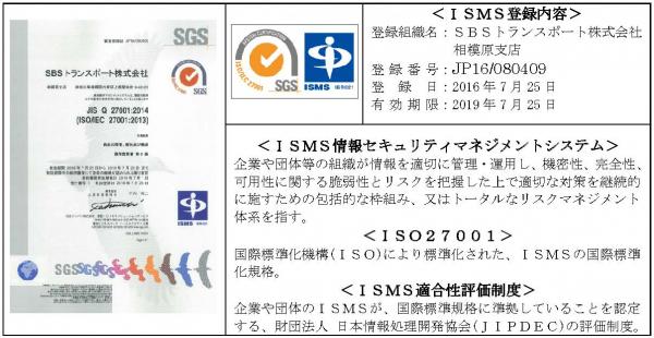 SBSグループにおいて東京・神奈川を中心に輸配送、センター運営、引越・移転などの物流事業を担うSBSトランスポート株式会社(社長:鳥海昭夫、本社:東京都世田谷区)は、同社相模原支店が平成28年7月25日、情報セキュリティマネジメントシステム(ISMS)の国際標準規格である「ISO27001」の認証を取得しましたのでお知らせいたします。