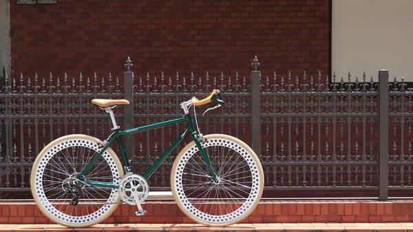 派手なリムに代わって、グリーンのフレームにベージュのタイヤを合わせたおしゃれな1台。