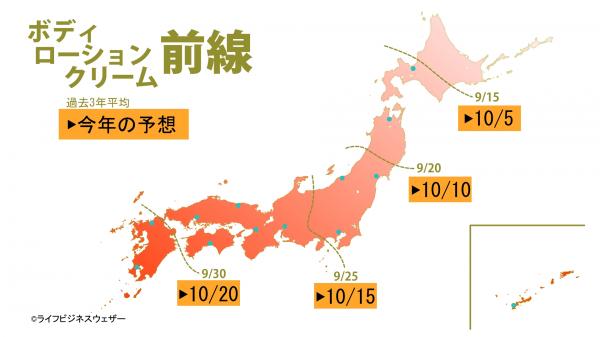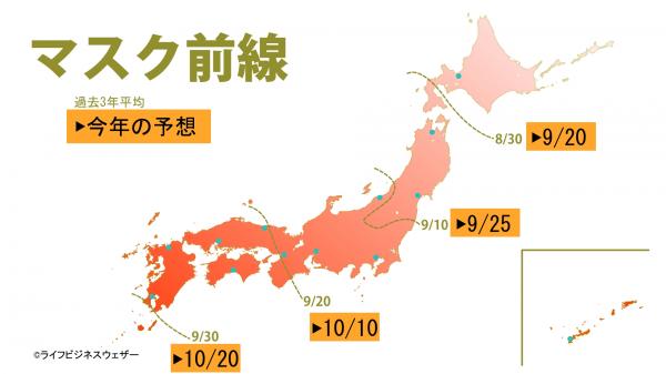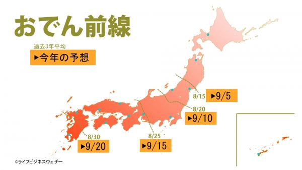 LBWのビジネス気象研究所では、過去3年間の全国のPOSデータと気象の関係から、秋冬物の売れ始める時期を「秋冬物前線」として分析しました。その結果、お盆を過ぎて最高気温が30を下回る頃になると、おでん前線が、25前後になると湿度の低下とともにマスク前線やボディローションクリーム前線が北から南下することが分かりました。この先も全国的に残暑が厳しく、また秋にはラニーニャ現象が発生する見通しから、9月10月の気温も全国的に高めで、秋の深まりはゆっくりでしょう。秋冬物前線の南下は、過去3年の傾向に比べて2~3週間ほど遅めになりそうです。おでん前線が北日本から南下を始めるのは9月に入ってから、東・西日本に到達するのは9月半ば頃でしょう。マスク前線の南下は北日本で9月下旬、東・西日本は10月に入ってから、ボディローションクリーム前線の南下は北日本でも10月に入ってからとなりそうです。ここ2年は西日本中心に8月の気温が低く、早めに秋が訪れていたことから、秋冬物前線も早めの南下でしたが、今年は3年ぶりに遅めの南下となるでしょう。