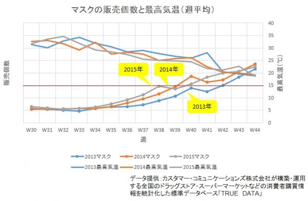 2014年と2015年の8月は西日本で気温が低く、比較的早く秋を迎えました。今年は猛烈な暑さに見舞われており、2013年以来の猛暑となっています。2013年、2014年、2015年の秋冬物の販売傾向を調べたところ、やはり2014年と2015年は早めに販売個数が増えていたのに対し、2013年は売り上げがなかなか伸びず、売れ始めの時期は2週間ほど遅めとなっていました。例としてある地域のマスクの販売個数と最高気温(週平均)を見てみると、マスクは最高気温が25前後まで下がると湿度の低下とともに売り上げが伸びることが分かり、2013年のマスク前線到達(売れ始め)は40週(10月初旬)、2014年は39週目(9月下旬)、2015年は38週目(9月中旬)でした。