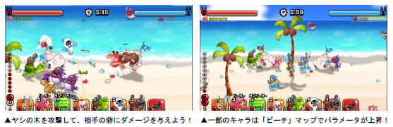 上下のどちらかに移動する「ヤドカリ砦」や相手の砦にダメージを与える「ヤシの木」がギミックとして