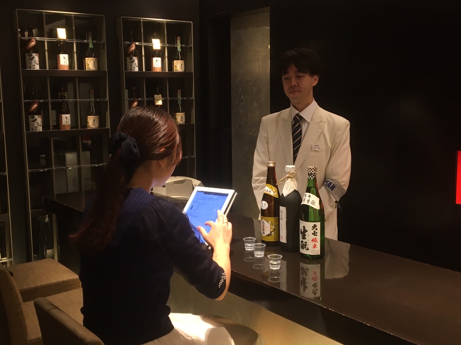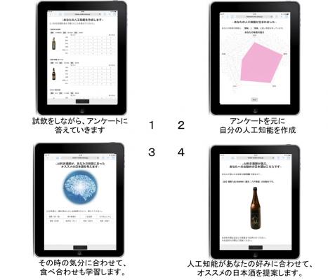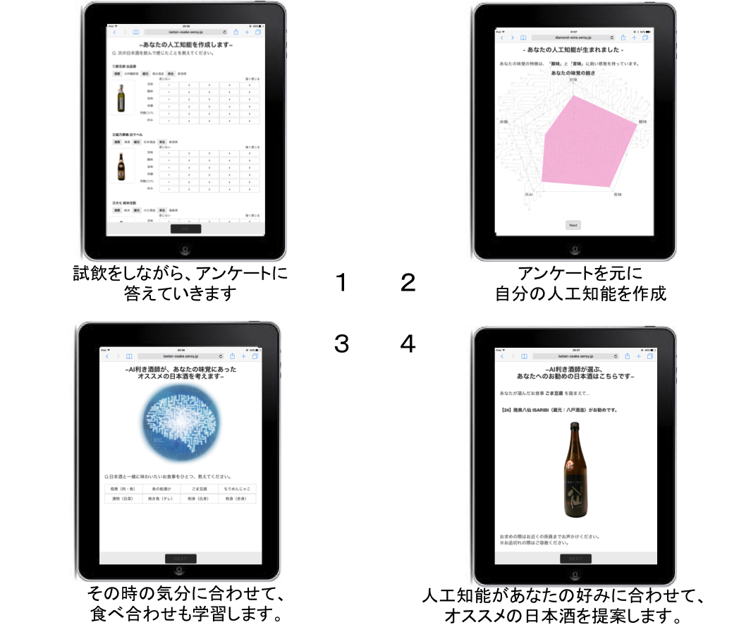 お客様に3本の日本酒を試飲していただき、それぞれの日本酒に対して、どう感じたかをアプリケーションにインプットすることで、人工知能が作成され、事前に用意された30本の日本酒の中から、ひとりひとりの味覚に合わせた最適な1本をセレクトします。