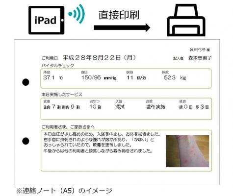 株式会社神戸デジタル・ラボ(本社:兵庫県神戸市中央区、代表取締役社長:永吉 一郎、以下 KDL)は8月下旬より、通所介護(以下、デイサービス)施設向けに、利用者家族と施設の間で使用する連絡ノートを作成できるiPad「デイオプションアプリ」の提供を開始します。当アプリは、2015年4月より販売する介護事業者向けスマートデバイスアプリ「介護サプリ」シリーズの第3弾として提供するものです。
