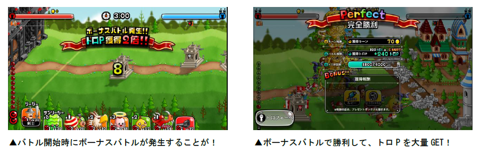 また、バトルを開始すると「ボーナスバトル」が発生することがあり、バトルの勝敗に関係なく、獲得トロPが