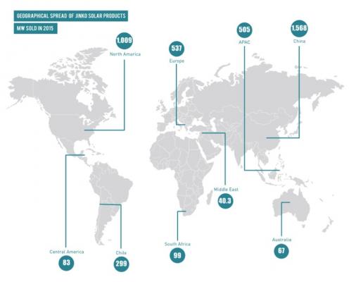 ジンコソーラー(NYSE: JKS)は太陽光発電産業のグローバルリーダーです。ジンコソーラーは中国、米国、日本、ドイツ、英国、チリ、南アフリカ、インド、メキシコ、ブラジル、アラブ首長国連邦(UAE)、イタリア、スペイン、フランス、ベルギー、その他の諸国・地域にあるさまざまな公益、商業、居住区顧客基盤に対し、自社ソーラー製品を供給し、自社ソリューションとサービスを提供、販売。ジンコソーラーは2016年3月31日時点で、垂直統合ソーラー製品バリューチェーンを構築して、シリコンインゴットとウエハーで3.5GW、太陽電池で3GW、太陽光発電モジュールで6GWの年間総発電容量がある。ジンコソーラーはまた中国国内で電力を販売しており、2016年3月31日時点で、約1007MWの太陽光発電プロジェクトをグリッドに接続、稼働しております。
