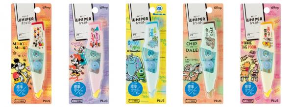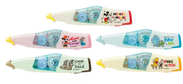 デザインは2製品共通、ミッキーマウス、ミニー&デイジー、サリー&マイク、チップ&デール、くまのプーさんの全5種類。メーカー希望小売価格(税抜)は修正テープ「ホワイパーPT」が300円(交換テープは定番品と共通で130円)、消しゴム「エアイン」は130円です。