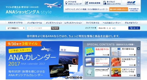 ANA STORE/ ANAショッピングA-styleがセレクトする商品やオリジナル開発商品を取り扱うANA公式のショッピングサイト。ANAマイレージクラブ会員を対象に、ANAのマイルがショッピングごとに貯められ、搭乗によって獲得したマイルをANAショッピングポイントに交換し、サイト内でのショッピングに利用できるサービスも行っています。オリジナル開発商品としては、「ANA DESIGN」シリーズをはじめ、「ANA TRAVEL LINE」シリーズの旅行グッズ、航空機部品の再生メモリアルグッズの「Reproduced goods」シリーズなど航空機ファン垂涎の商品群など、ANAのグループ企業ならではの商品群を続々発表しています。