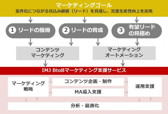 IMJは、企業のマーケティング施策実現のためのコンテンツマーケティングと、マーケティング活動の効率化を推進するマーケティングオートメーションを活用したBtoBマーケティング支援サービスを提供いたします。