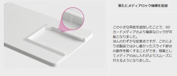 小さな突起を追加したことで、SDカードメディアのより確実なロックが可能となりました。ほんのわずかな変更点ですが、これにより旧製品では少し重かったスライド部分の動作を軽くすることができ、結果としてメディアの出し入れがよりスムーズに行えるようになりました。