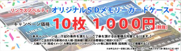 初めてご注文される新規の法人様・団体様に限り、オリジナルSDメモリーカードケースをキャンペーン価格:10枚、1,000円(税抜)にて作成いたします。ノベルティの検討や提案にご利用ください。