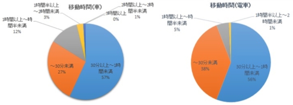 圧倒的に多かった車移動ですが、「移動時間はどれくらいですか?」と質問したところ、電車、車での移動において、共に「30分以上~1時間未満」が最も多い割合で60%近く、次いで「30分未満」となりました。